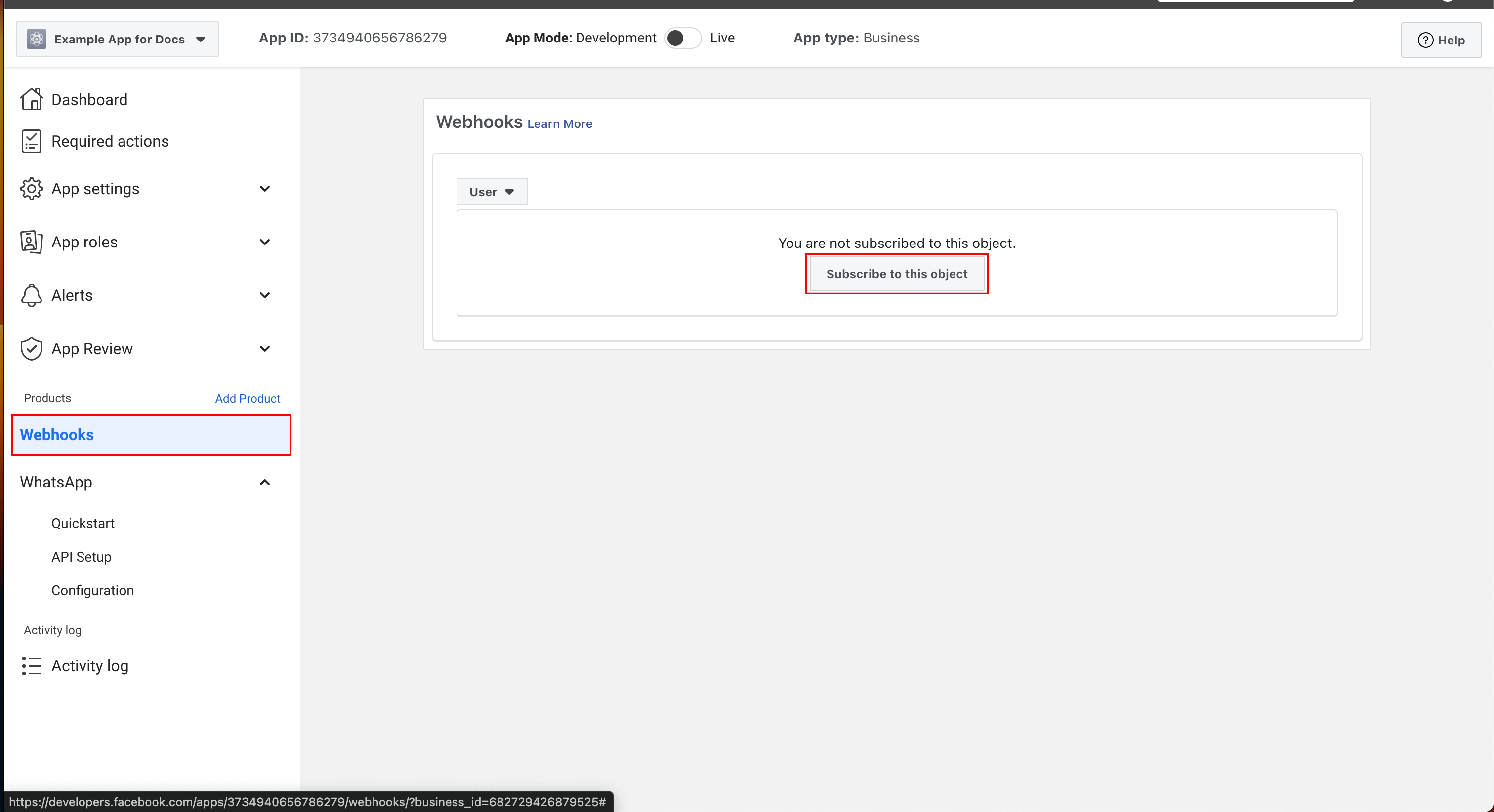 Follow the steps below to submit your webhook URL to the Whatsapp Business Platform and enable incoming events routing to your local development setup:Visit Your App Dashboard